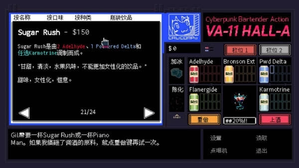 调配框:屏幕右侧为调配框,当中会显示五种调酒材料(adaelhyde、bronson ext、pwd delta、flanergide.karmotrine) 、两种添加物(冰块、age) 、两个槽(1槽、2槽)以及两个操作键(重置和混合)。特别注意操作键"混合",初期混合是属于轻度摇晃,当5秒钟过后则会变成快速摇晃,某些饮品属于轻度摇晃的,则不能快速摇晃。