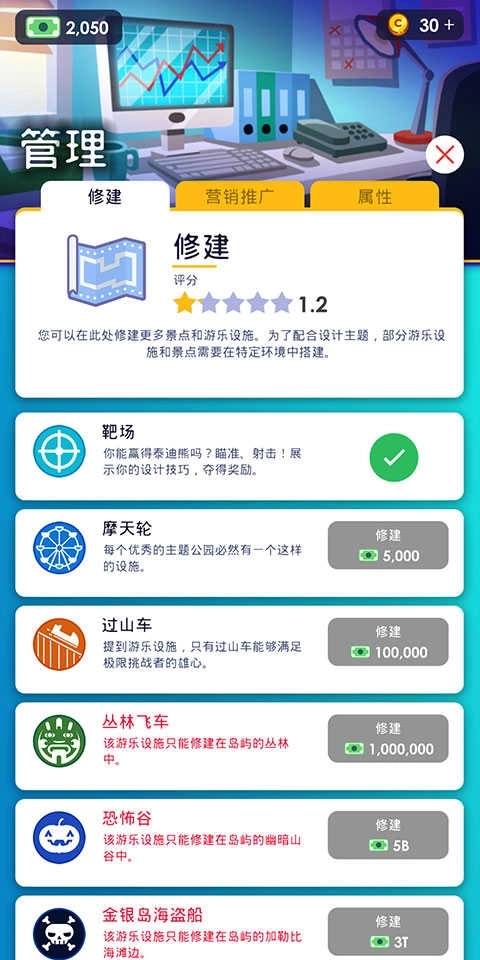 园区扩张升级:积累资金后开发新岛屿,扩大公园规模,不断升级设施与建筑,提升公园品质与吸引力 。