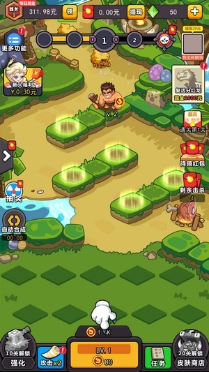2、许多原始人都有各自的等级,轻松进行合成,升级后带来更多收益。