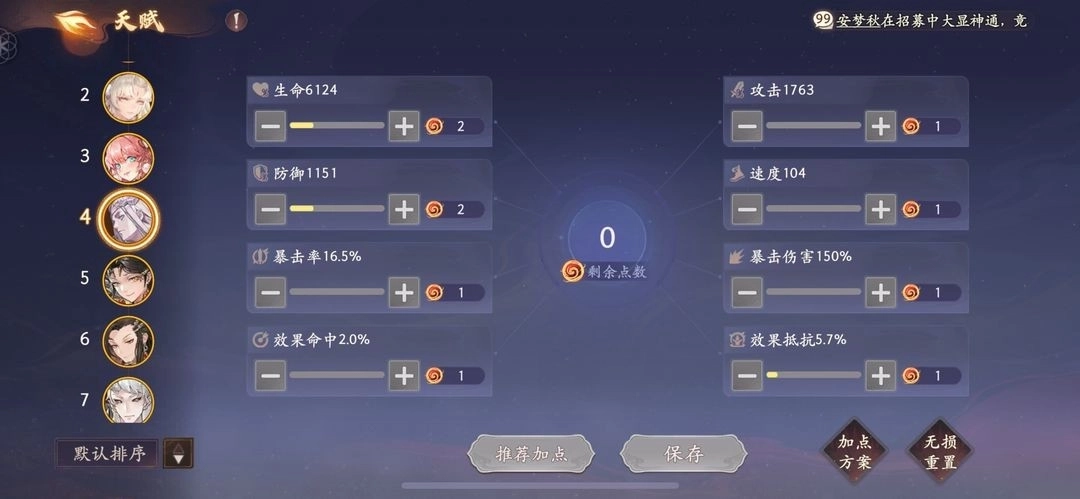 注意的点:控制位,跟玉面狐狸都需要极致的速度,其他角色的速度可以均点。
