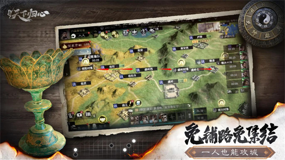 三国天下归心是一款三国系列的战争策略游戏,游戏开始后,你可以选择自己打的阵营。选择好后就可以开垦土地、招兵买马了。和真实的三国不同,游戏中你可以培养任何你喜欢的谋士和武将。比如说你可以让诸葛亮给曹操效力。快去合并魏蜀吴,一统天下吧。