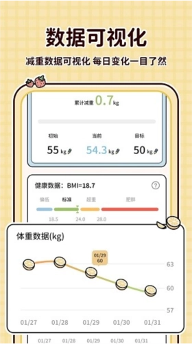 2、全面记录与追踪:每日体重、身体状况皆详细记录。可视化的数据报告,助您实时掌握身体变化,见证每一个蜕变时刻。