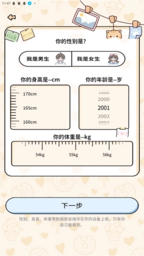 1、首先,在这里输入你现阶段的身高、年龄以及体重信息。