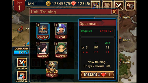 1、通过不断的囤积粮草和资源,玩家可以不断地打造提升自己的军队战力。