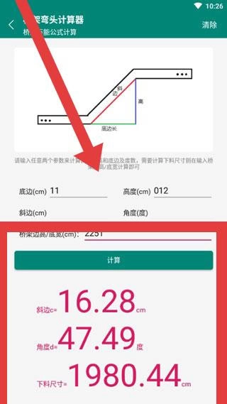 1. 于计算界面录入桥架的底面宽度与垂直高度数值,便能迅速得到斜边长度、弯曲角度以及材料切割尺寸等关键结果,使现场工程测算流程得以简化。