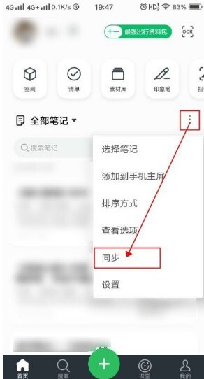 6、返回首页后,找到“全部笔记”右侧的三点图标并点击,接着选择“同步”选项,这样就能在首页刷新出刚刚保存的笔记了。