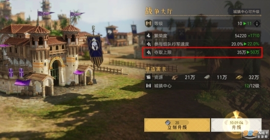 攻打其他玩家能掠夺到不少资源,不过每天有特定的上限。当城镇中心达到12级时,就可以建造战争大厅,这样能提高每日的掠夺上限。