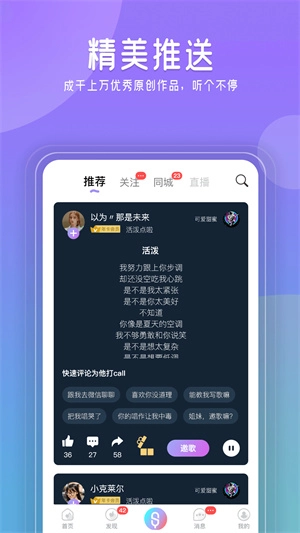 想邂逅声音动人的小哥哥小姐姐?闪歌的音乐社交功能,助你和男神女神拉近距离!精心创作的歌曲无人问津?快邀请微信、QQ好友来听,收获满满夸赞吧!