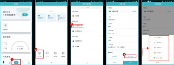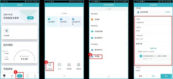 选择 ①【+】按钮,接着选择 ②【新建单据】选项,然后挑选适用的 ③【报销单】;在填写报销单时,能够借助 ④【导入明细】的功能来快速导入发票信息,同时还可以校验开票信息的准确性。