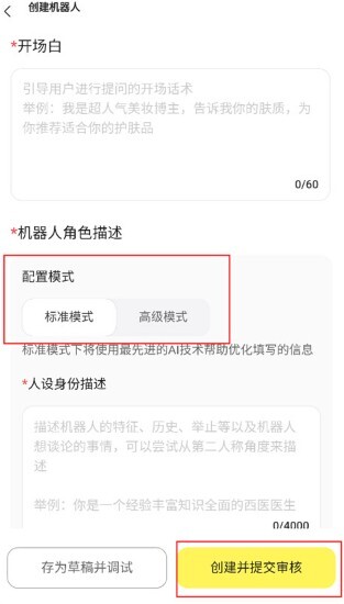 3、在输入框中设置机器人的开场白,选择配置模式,详细描述人设身份。完成后点击右下角的“创建并提交审核”按钮即可。