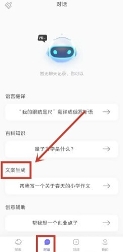2、对话页面,选择查看文案生成分类模块。