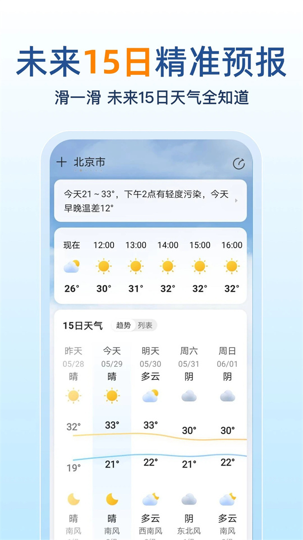 15天精准预报:提供未来15天的详细天气预报,包括每日气温、降水概率、风速等信息,帮助用户提前规划出行。