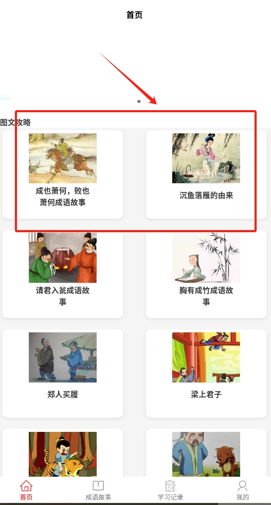 1、点击图文攻略查看成语故事卡片,上下滑动可以浏览更多成语典故哦。