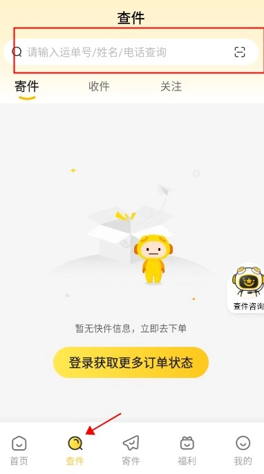 2、然后点击查件,输入运单号或电话进行查询,姓名可能会有重复,不是很推荐。