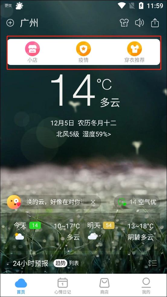 4、在上面我们是可以看到穿衣推荐。
