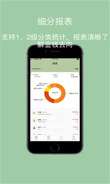 支持一级分类、二级分类等各类报表统计,能轻松掌握资金流向,便于及时调整消费习惯。