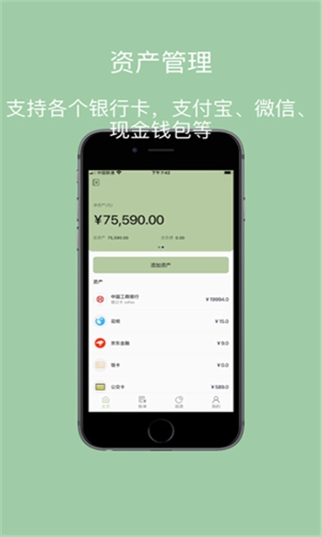 支持银行卡、支付宝、微信、现金钱包等各类资产账户,便于对负债与净资产进行管理和统计,能轻松掌握个人财务状况。