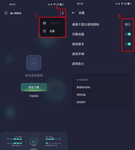 4、点击右上方的“:”按钮,还能进行隐藏桌面游戏图标、开启游戏助手、调整游戏空间布局等个性化设置操作。