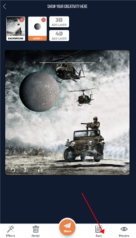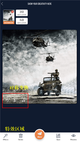4、点击顶部的3d或4d图标即可添加素材,你可以把多个素材融合在一起,创作出新的壁纸。