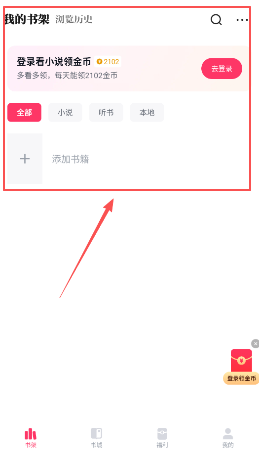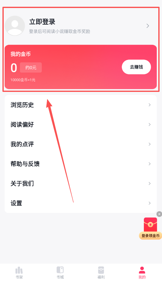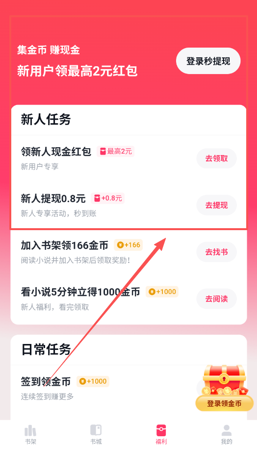 1、首先打开软件并完成账号登录,登录后在首页可看到“登录看小说领金币”的提示,同时在福利页面还能参与新人任务。