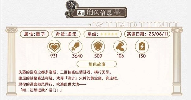 1、角色属性为量子,命途属虚无,基础属性含生命931、攻击3640等,背景是失落盗寇之都多洛斯的三百侠盗,惯行劫盗戏码。