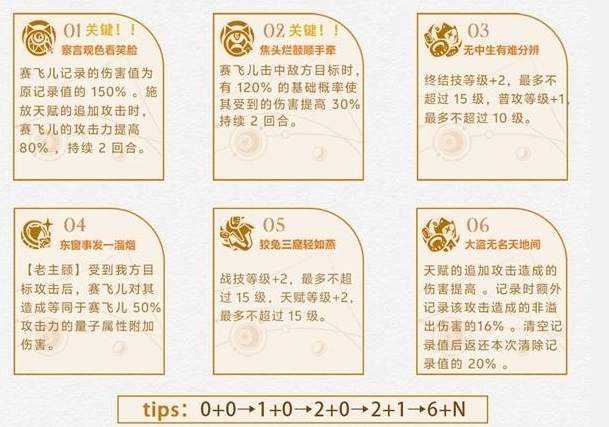 3、养成步骤:建议按照0+0→1+0→2+0→2+1→6+N的顺序推进,优先激活1、2这些关键星魂,再逐步解锁高阶效果,以此实现伤害增益与机制联动的最大化。