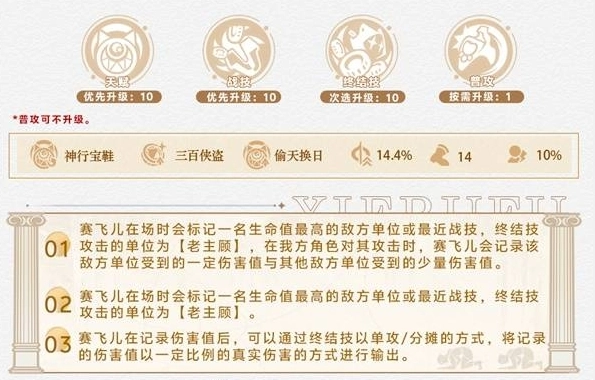 3、技能优先把天赋、战技升至10级,终结技次选升10,普攻按需升1级,赛飞儿标记敌方后记录伤害,借终结技转化真实伤害输出。