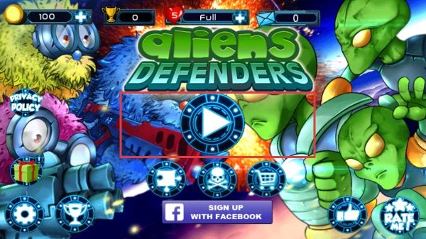 1、在主界面点击【播放键】,即可开启【aliens DEFENDERS】玩法,建议先查看功能键(商店、成就)以熟悉玩法规则。