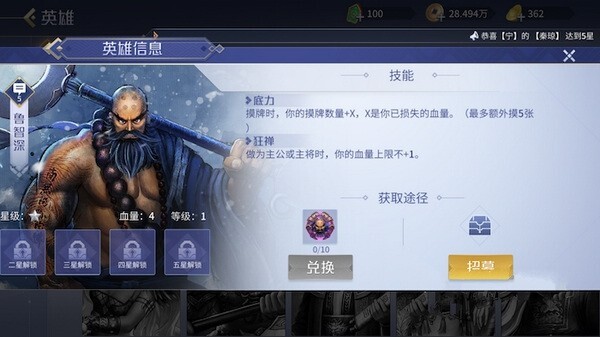在英雄杀团战里稍显乏力的鲁智深,到了单挑模式可算是扬眉吐气——这个越挨打越强悍的和尚,堪称不少英雄的噩梦。建议大家把血量卖到两滴就行,此时鲁智深每回合能摸4张牌,对手却只能摸两张,他摸到桃子和AK的概率远高于敌方;合理运用存桃和画地为牢的战术,就能让鲁智深掌控战局,等时机成熟再把目标一波带走。