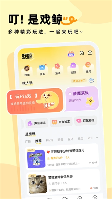 戏鲸能为用户提供十分便捷的语音交友服务,大家可以直接在线连麦创建语音房,平台上有丰富多样的剧本可供挑选。软件里涵盖了从动画到解说等各类有趣视频,在线配音和玩游戏都很轻松简单,并且还会不定期举办活动让大家参与。