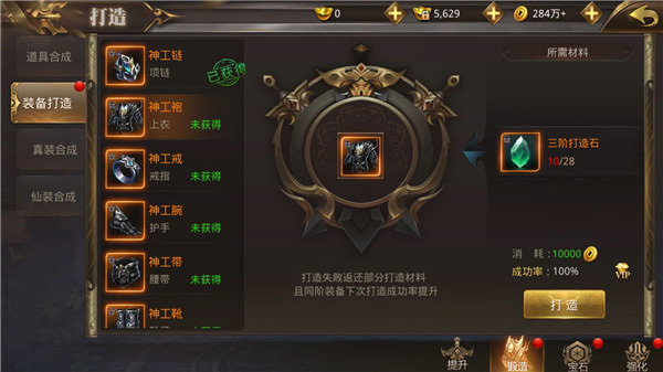 可打造的装备分为5阶,每提升1阶装备战力将获得大幅度提升;不同阶数的装备打造需要消耗不同等级的打造石;而这些打造石的获取方式有很多,从游戏活动、装备副本、主线副本中都能得到。