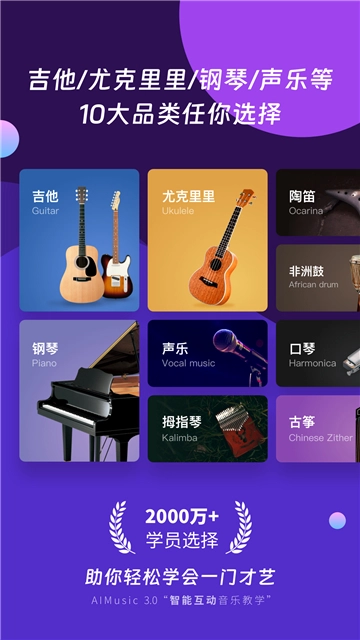 自2017年正式上线至今,我们已为超2000万学员提供专业教学服务。无论您想学吉他、尤克里里、钢琴、电吉他、拇指琴、口琴,还是古筝、非洲鼓等乐器,AI音乐学园全年365天始终陪伴在侧,助力您轻松掌握一门才艺,邂逅更优秀的自己!