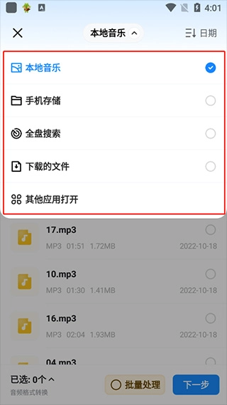 5、这里可以选择:本地音乐、手机储存、全盘搜索、的文件等。