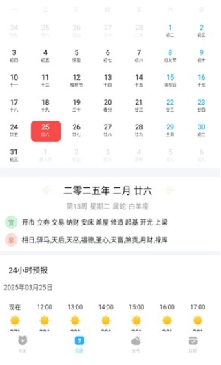 3、除了天气预报功能外,用户还能查看日历,软件会依据黄历给出详细的解读内容