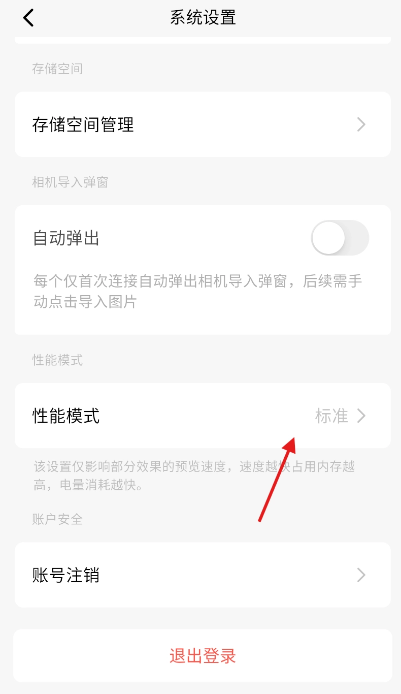 3、进入系统设置页面后,向下滑动屏幕,找到“性能模式”这一设置选项,点击该选项即可进入性能模式的选择界面。