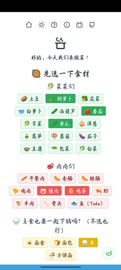 2、进入软件首页后,挑选想要使用的食材、厨具等。