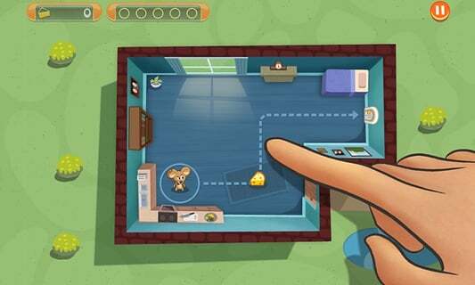 第四关里,间谍鼠的逃生门恰好位于猫咪移动路线的后方,被牢牢堵住。奶酪也在小黄猫的正前方,因此按照游戏提示,玩家首先得把猫咪引开。之前小编也提过,这个场景里的黄色小猫,移动速度和反应能力都相对较慢,所以玩家只要出其不意地改变间谍鼠的移动路线,先吸引小猫的注意力,让它离开原本的移动路线来追捕间谍鼠,然后控制小老鼠在猫咪身后跑,再根据箭头提示迅速到达奶酪位置,最后从门口逃生,就能轻松躲开小猫了。