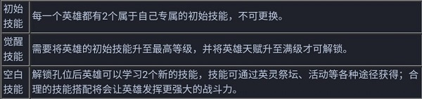 英雄技能类型分为3类,分别是初始技能、觉醒技能和空白技能: