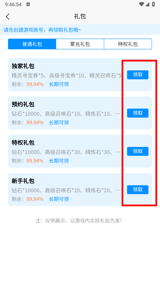 注意:先创建游戏账号,再领取礼包哦。