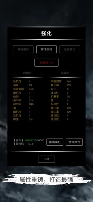 3、重铸系统:消耗一定数量的金币与若干重铸石,即可对武器或装备的属性值进行随机重铸。