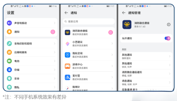 目前这类通知选项都处于开启状态。用户可以通过点击手机的“设置”按钮跳转至相关页面进行快速配置,具体路径为:设置→通知→找到“消防融合通信”应用→开启允许通知;此外,其他所有通知类别也均已设置为开启状态。