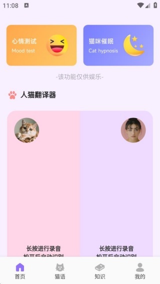 3、不仅具备猫宠翻译、心情测试这类娱乐功能,还涵盖猫咪知识、猫语训练等实用功能,实现了娱乐与实用功能的融合。