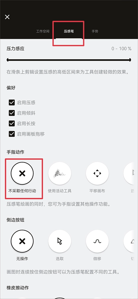 3、最后在压感笔界面中的手指动作内,选择不采取任何行动即可关闭