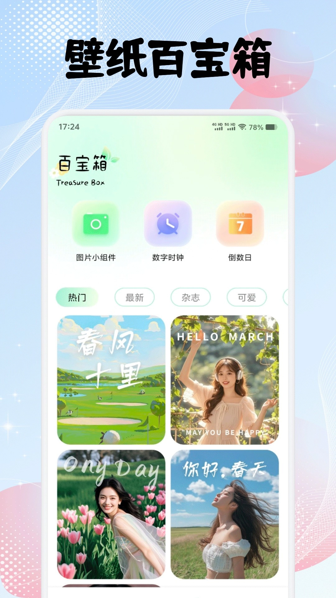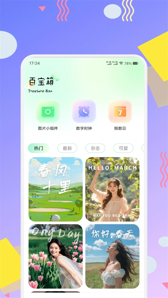 提供天气、时钟、电量、倒计时等组件,随意组合打造多彩桌面。