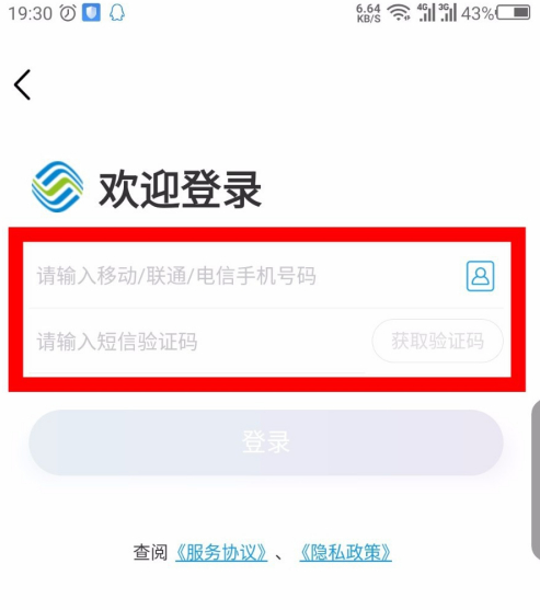 输入移动手机号码,获取短信验证码,勾选同意登录条款、协议及隐私政策后,点击“登录”按钮。