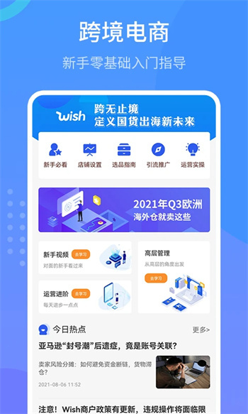 Wish跨境电商手册是一款助力用户开展电商销售的辅助软件。用户可通过该软件学习直播教程,内容涵盖运营与操作指导,帮助用户掌握更多销售技巧,并能从中挑选适合自身的经营方式。从店铺设置、选品指南到引流推广,软件均有涉及,既支持用户进行运营实操,推动店铺高效运转,助力用户获取线上收入,还提供宣传方法、高阶管理、新手入门视频及运营进阶等学习内容,用户可随时在线学习。