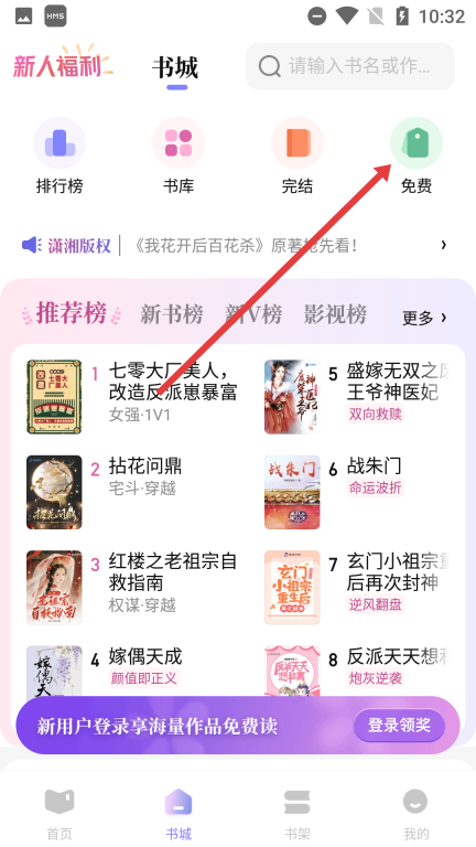 2、在书城界面,点击【免费】选项,进入免费专区页面。