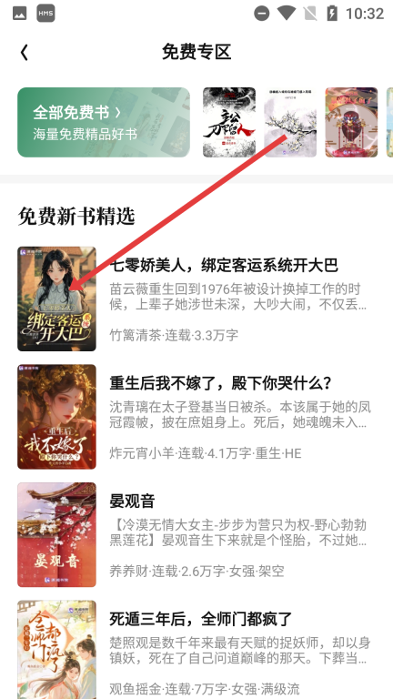 3、在免费专区页面,选择目标书籍,如【七零娇美人,绑定客运系统开大巴】并点击进入书籍详情页。