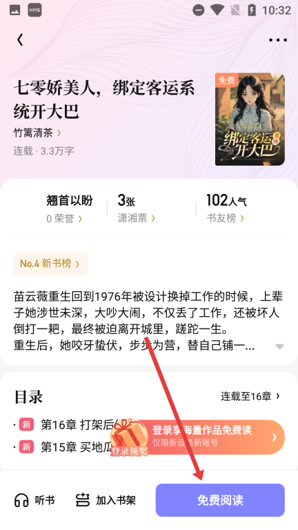 4、在书籍详情页,点击【免费阅读】按钮,即可开始阅读该书籍。
