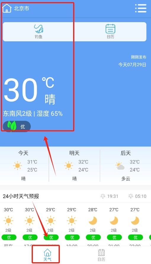 2、可查看全国各地实时天气预报,涵盖逐小时天气、未来24小时变化情况,以及温度、空气质量等相关信息。